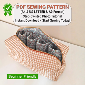 This pattern includes A4, US Letter, and A0 printable files, making it easy to print at home or at a print shop. The step-by-step photo tutorial walks you through each stage of the sewing process, and all pieces are clearly labeled for an easy, enjoyable project. Designed for beginners and intermediate sewists, this organizer features a fully quilted structure that adds both softness and protection, while keeping its shape beautifully. Whether you're sewing for yourself or as a thoughtful handmade gift, this pattern guides you to a polished, professional result.